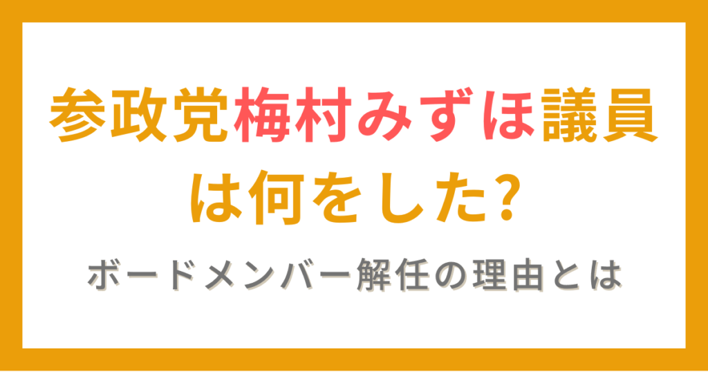 参政党の梅村みずほ参議院議員がボードメンバーを解任されました。 この記事では梅村さんが何をしたのか、解任の理由を整理してまとめています。 梅村みずほ解任の概要 梅村さんは党の中心的メンバーであるボードメンバーでしたが、今回解任されたことで、... -