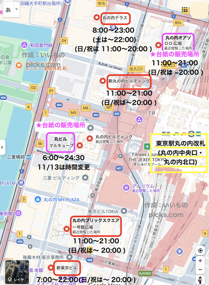 この順番で回る場合、JR東京駅 丸の内改札 丸の内北口が最寄りです。