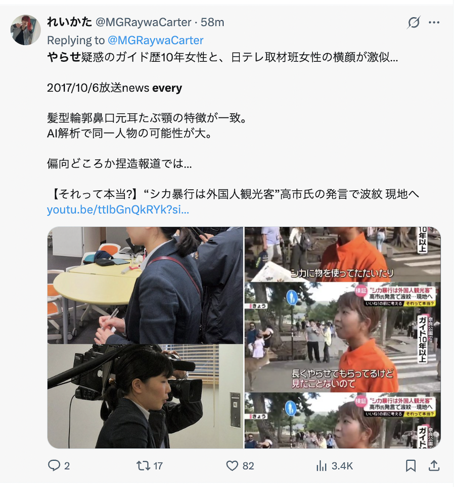 「外国人が奈良公園の鹿を暴行している」という高市早苗さんの発言を検証する特集でした。