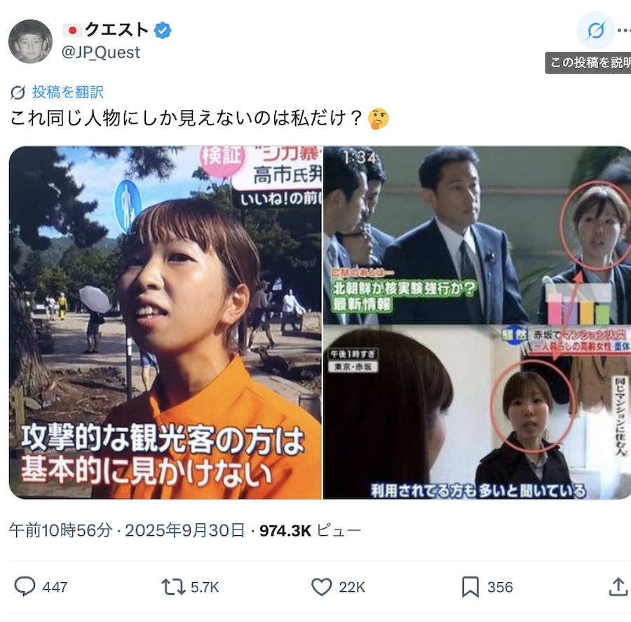 ①「10年バスガイドをしている」という女性は、過去に別の報道で出演した女性と同一ではないかと噂されています。