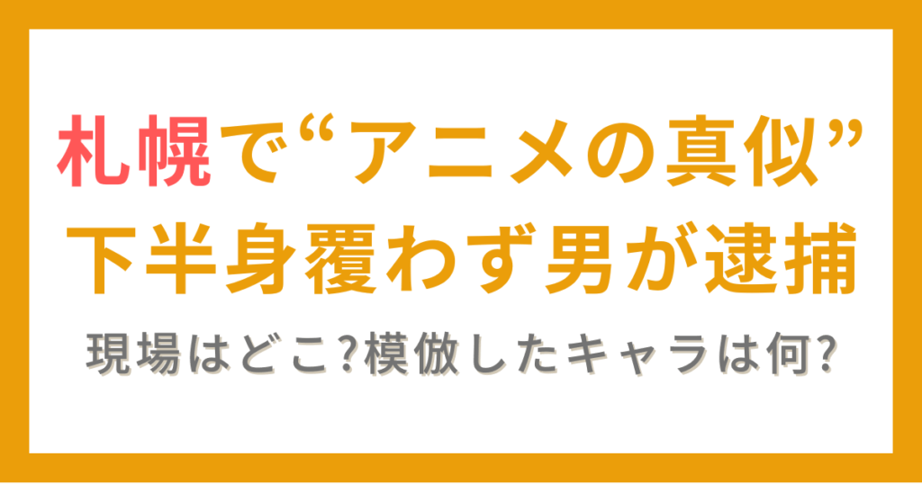 北海道札幌市で、「上半身はダウンジャケット、下半身は下半身を覆っていない」男が逮捕されました。 この記事では、事件の概要や現場はどこなのか、犯人は何者なのかをまとめています。 また、男は「アニメのキャラを模倣した」とのことで、何のキャラク...